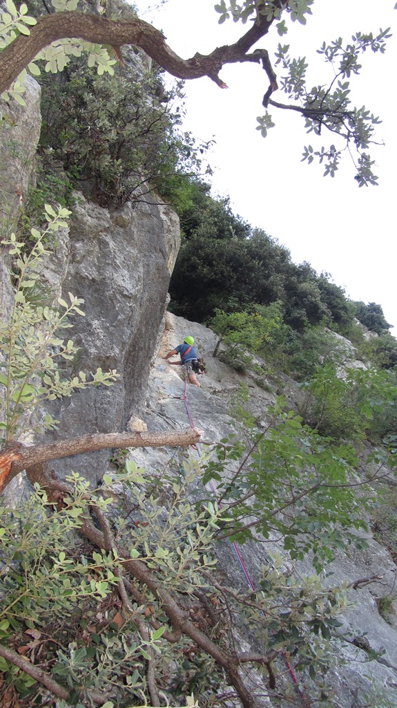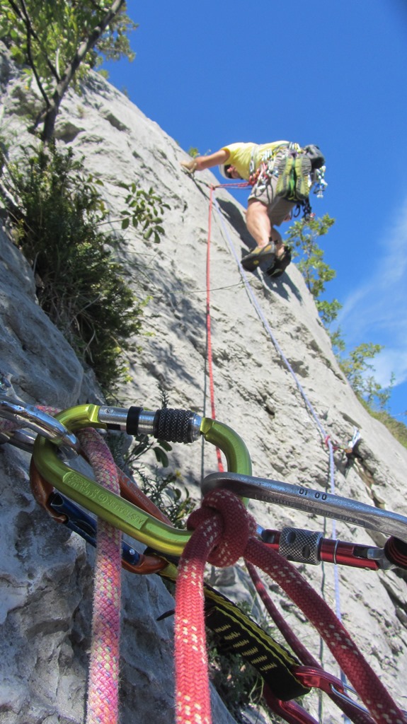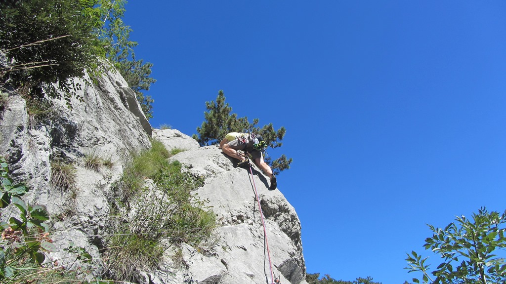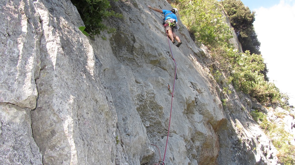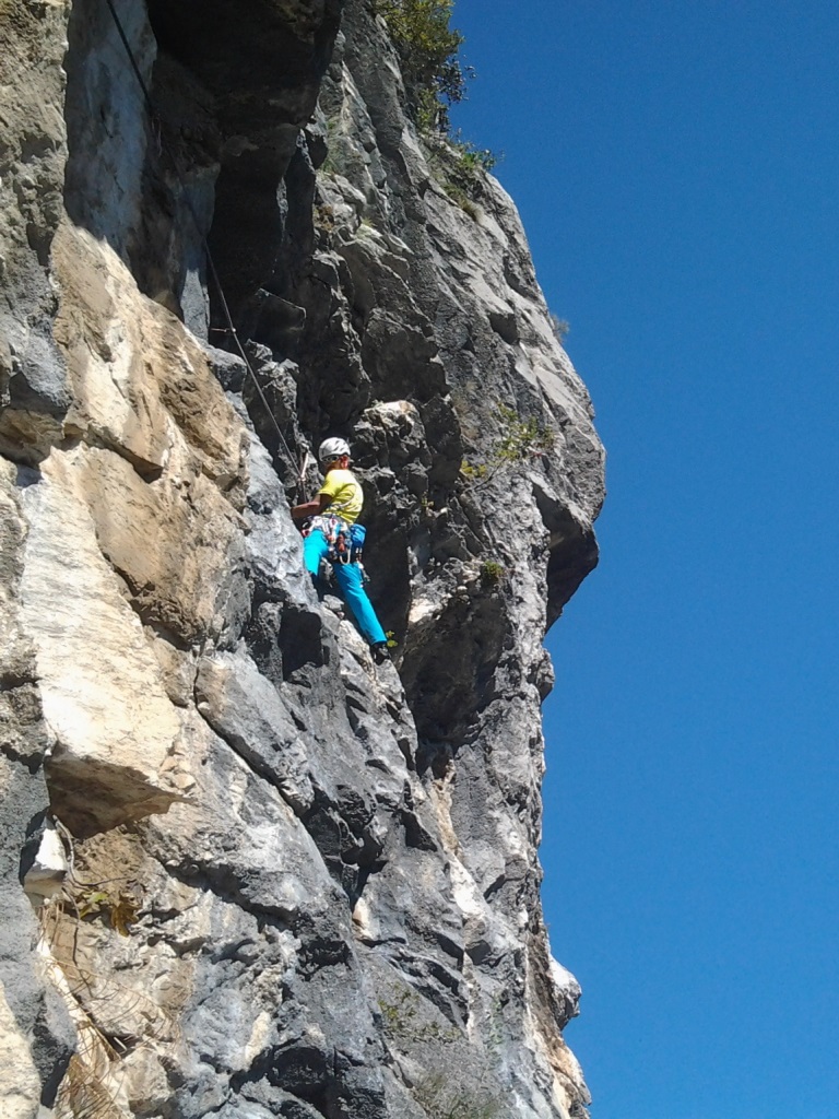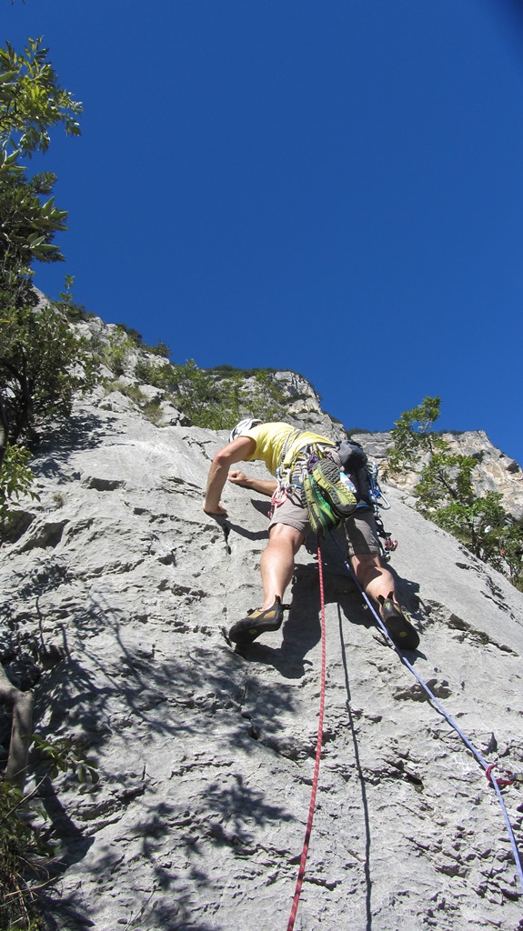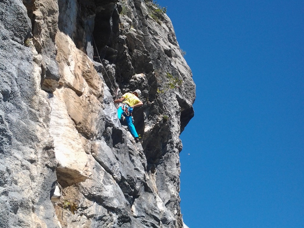 Die leider etwas überschwängliche 5 Stern Bewertung in unserem Führer führte uns zur Minuette a Ceniga. Wirklich überzeugen konnten uns die Route vier sehr schöner Längen leider wegen des vielen losen Gerölls und den drei botanischen Ausstiegslängen leider nicht. Generell hat es der Führer in diesem Sektor sehr gut mit seinen Ausführungen gemeint und nicht mit Atributen wie „hervorragen“, „absolut lohnend“ oder ähnlichem gespart.