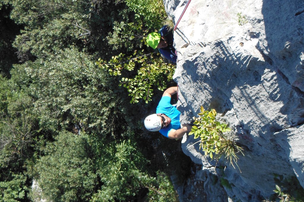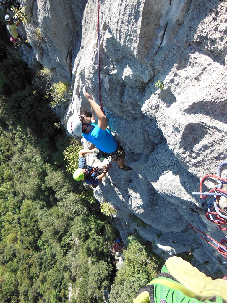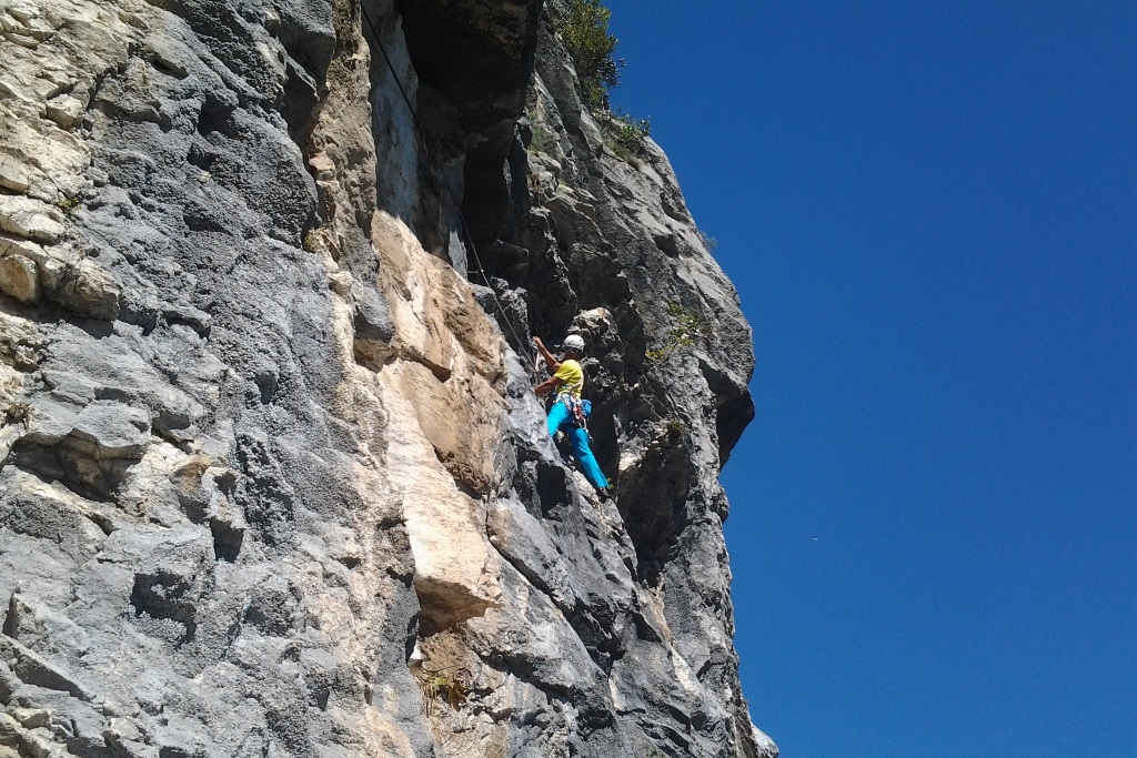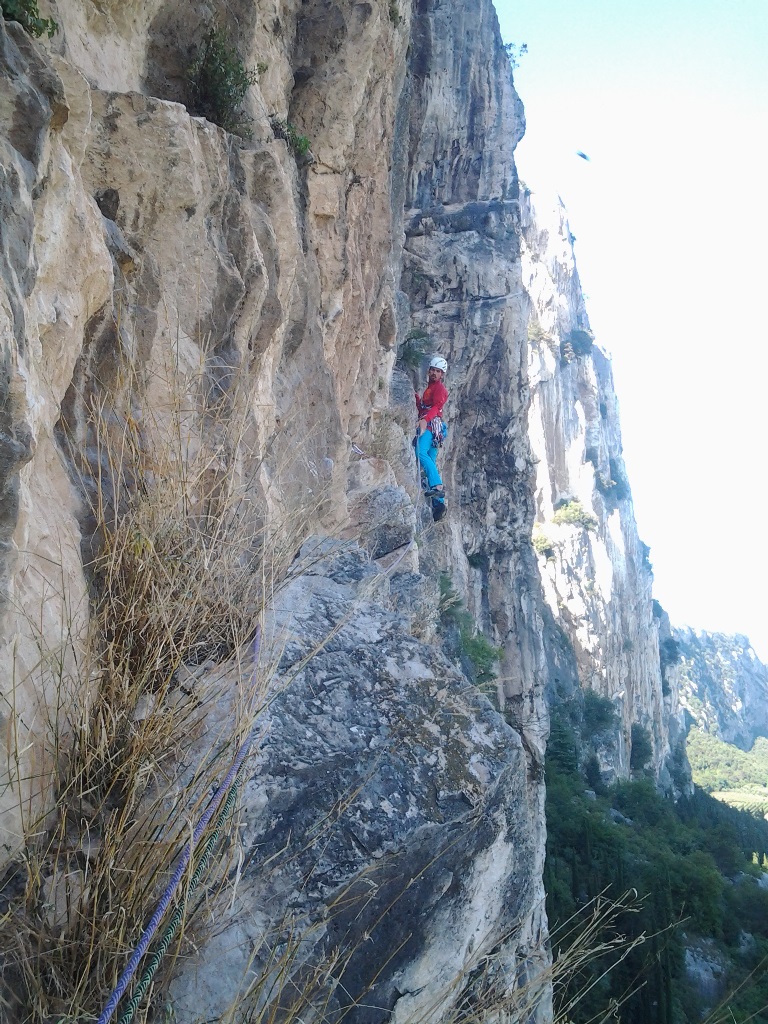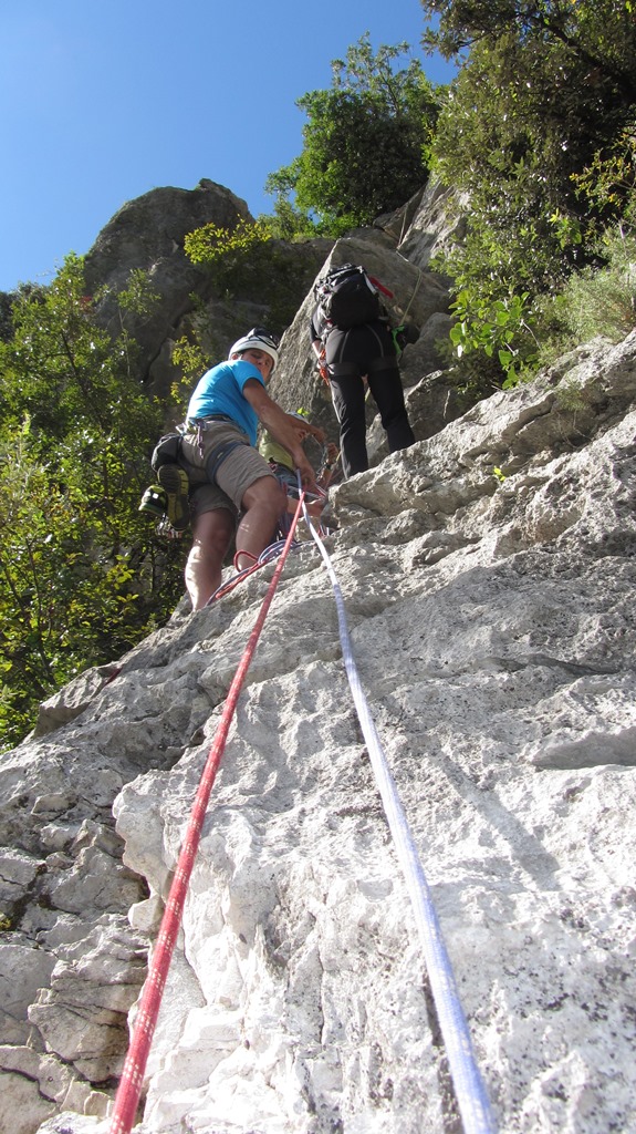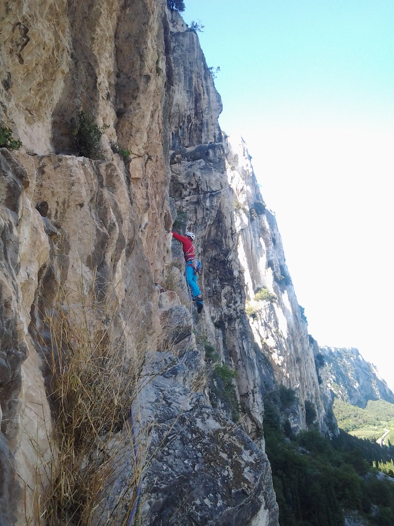 Die leider etwas überschwängliche 5 Stern Bewertung in unserem Führer führte uns zur Minuette a Ceniga. Wirklich überzeugen konnten uns die Route vier sehr schöner Längen leider wegen des vielen losen Gerölls und den drei botanischen Ausstiegslängen leider nicht. Generell hat es der Führer in diesem Sektor sehr gut mit seinen Ausführungen gemeint und nicht mit Atributen wie „hervorragen“, „absolut lohnend“ oder ähnlichem gespart.
