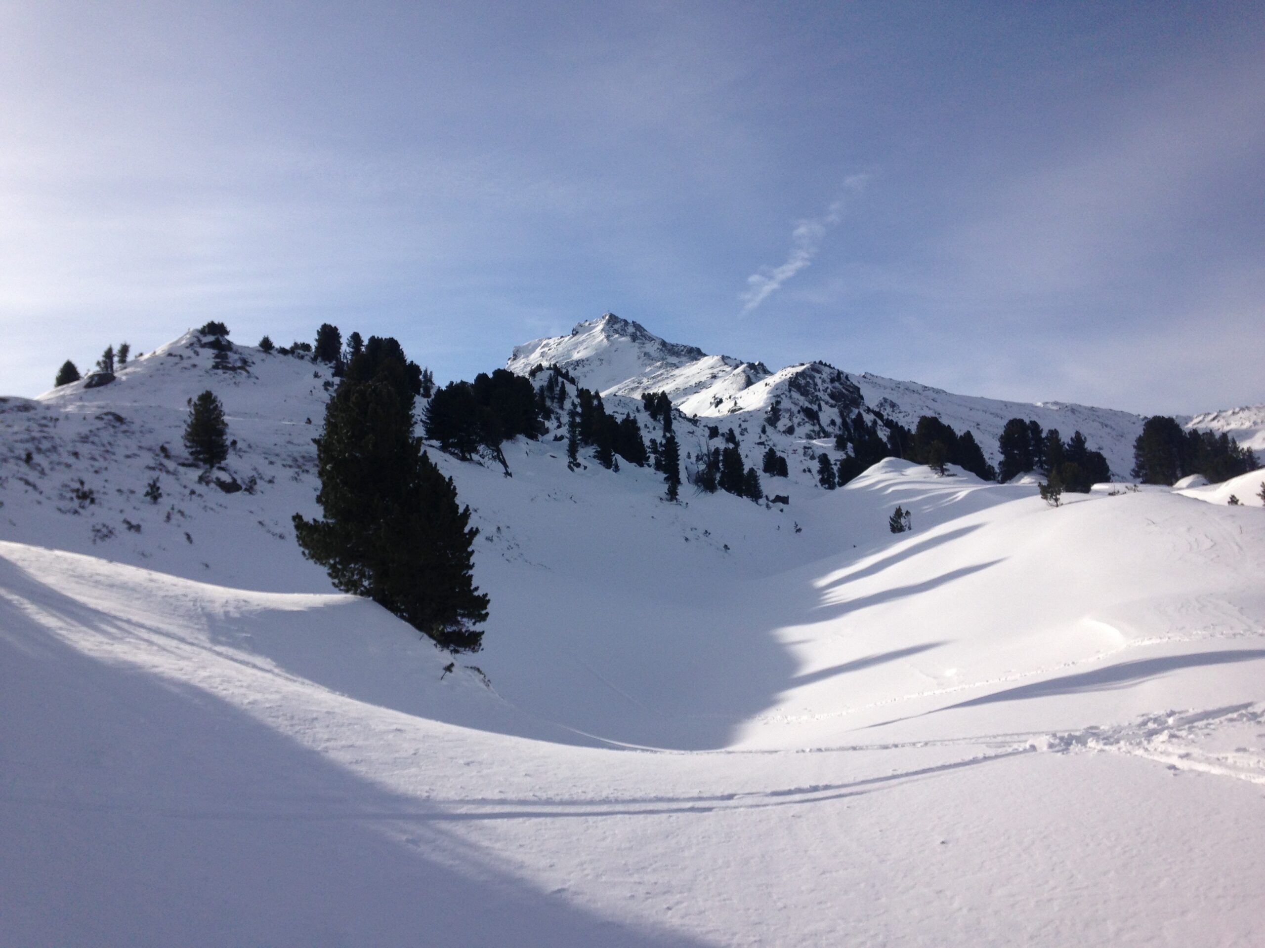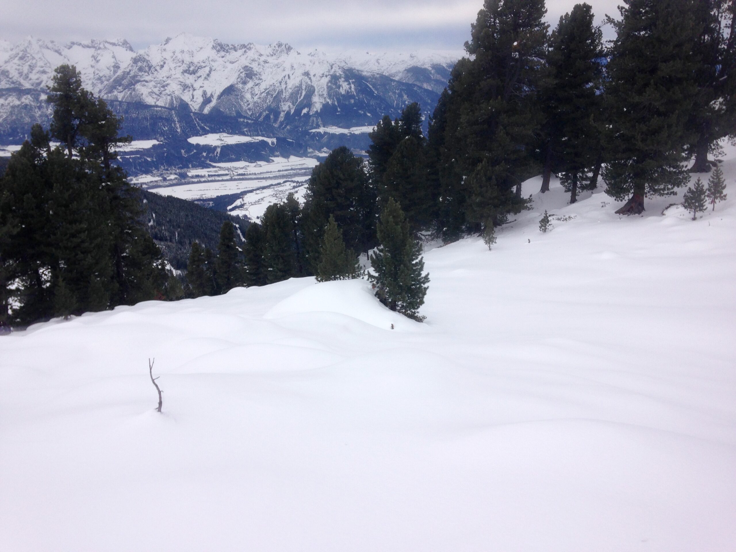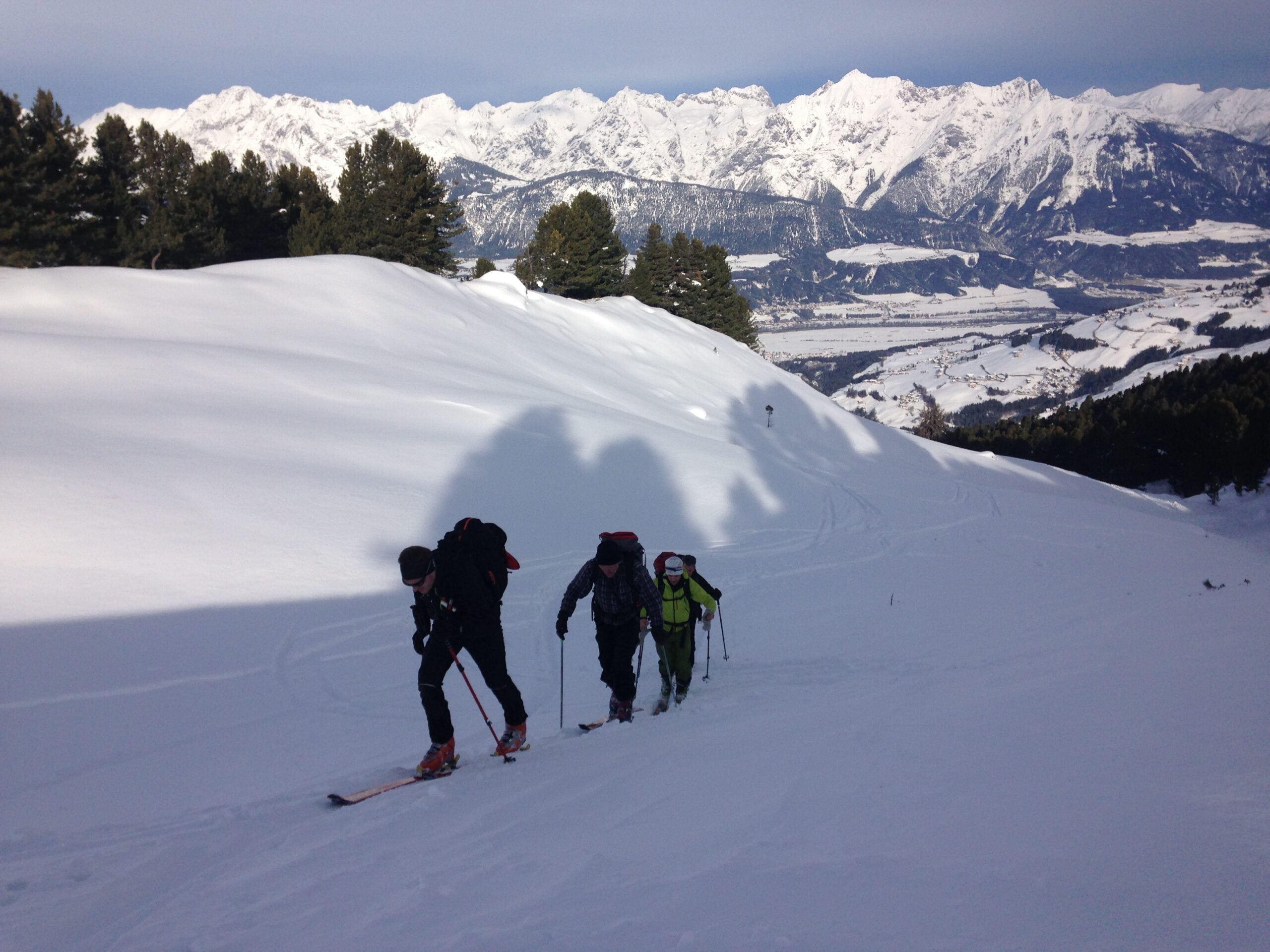 Am 24.Jänner 2016 wurde kurzfristig zu einer Bergrettungsskitour ins Kolsasstal einberufen, um das Gelände samt Schneequalität zu prüfen. Der Weg auf die Studlalm ist gut geräumt und gut befahrbar – nicht zu tief nieder geschert wie in den vergangenen Jahren. Die Spur auf den Hillary Point ist gut und angenehm zu gehen. Am Kreuz konnten wir die Sonne genießen – bis der Südwind uns zum Aufbrechen veranlasste. Wir spurten noch ein paar Meter südwärts Richtung Wildofen, wo wir einige Wumm Geräusche vernehmen konnten. Wir entschieden uns nordwärts abzufahren. Generell fanden wir, wie beim Aufstieg schon erkennbar, grundlosen Pulverschnee vor, dieser war aber doch insgesamt schön zu fahren.