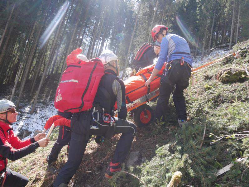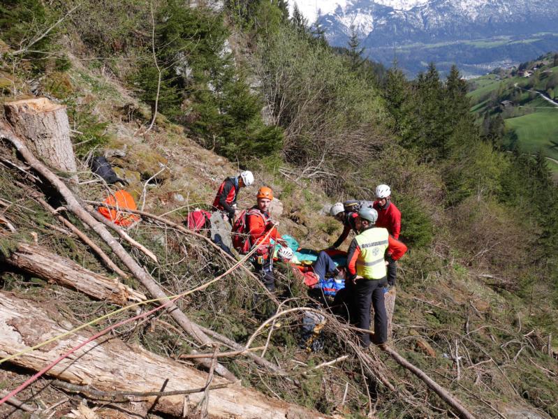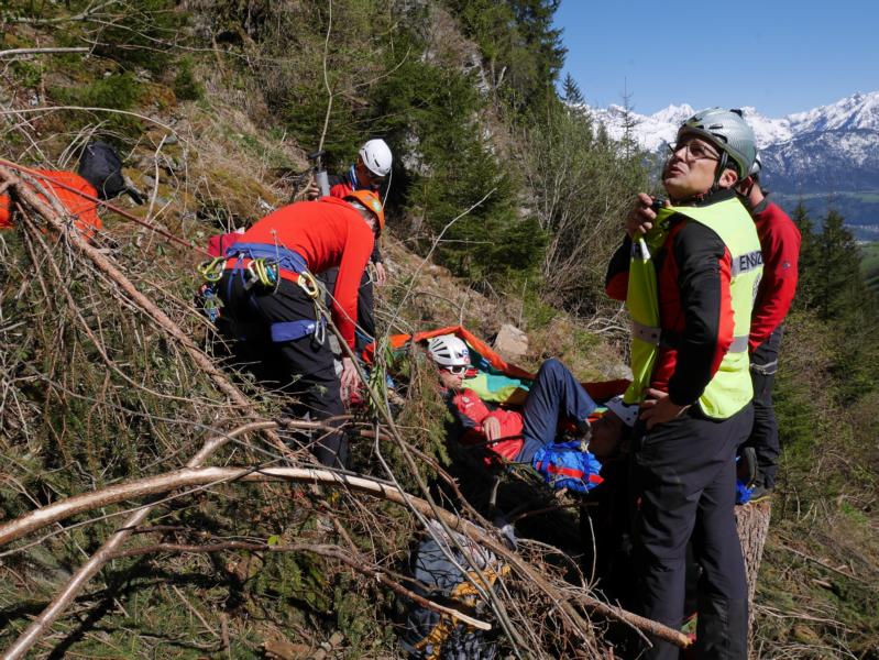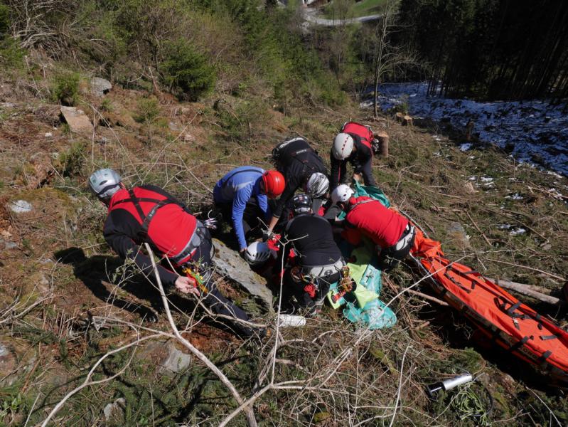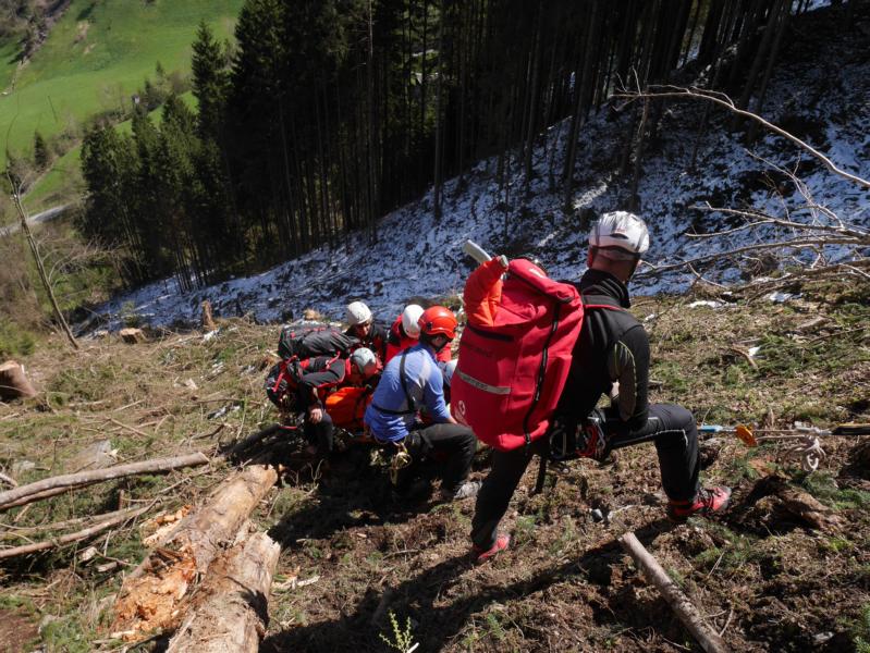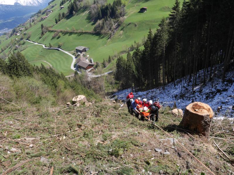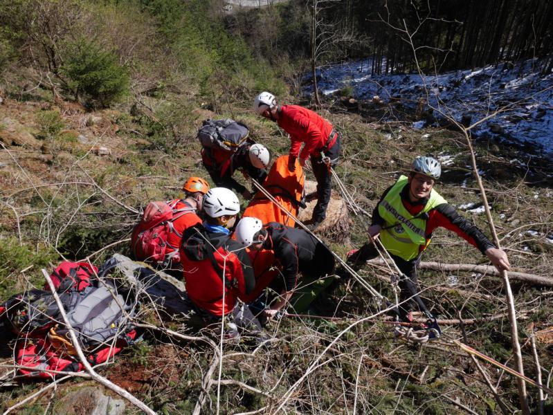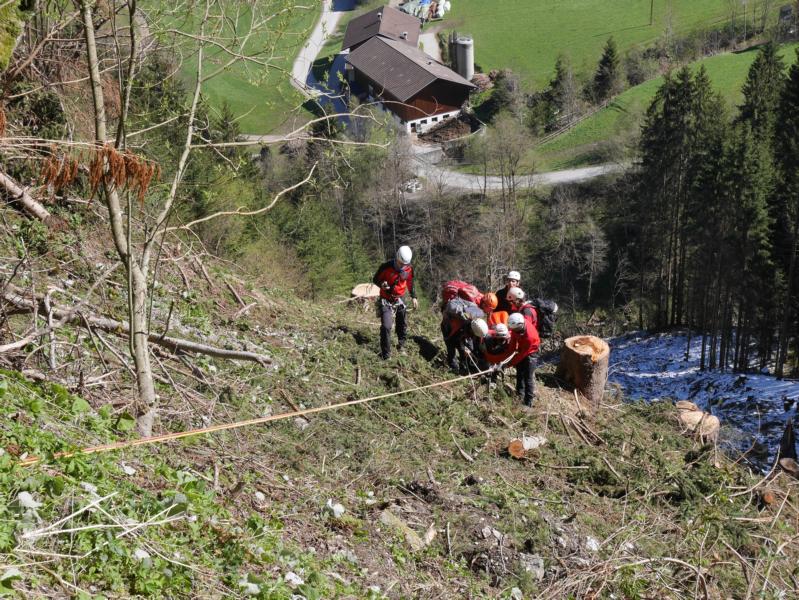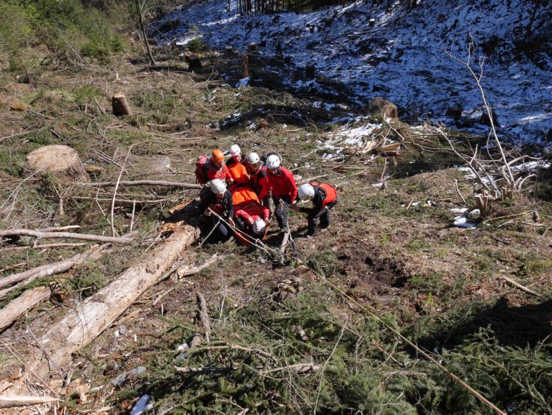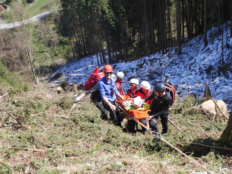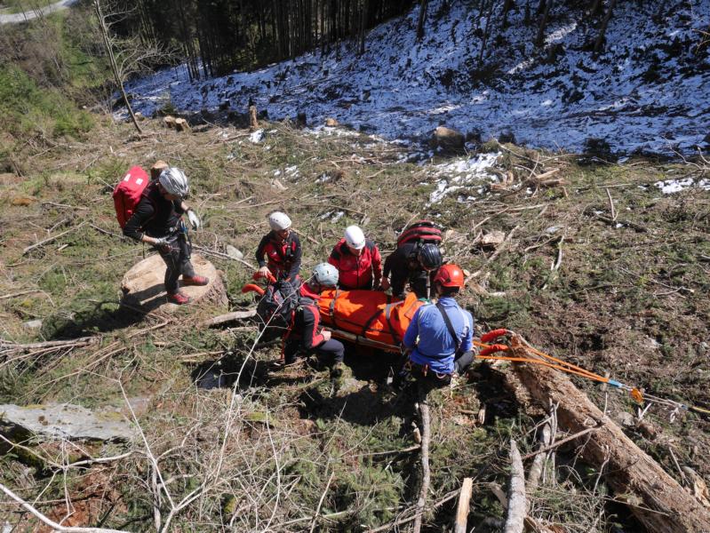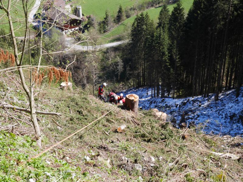 Im Zweiten Teil des Übungstages ging es um die Bergung eines verletzten Holzarbeiters aus einem Holzschlag. Dieser wurde zweimal mit ausgewechselter Berge- und Standmannschaft durchgeführt.