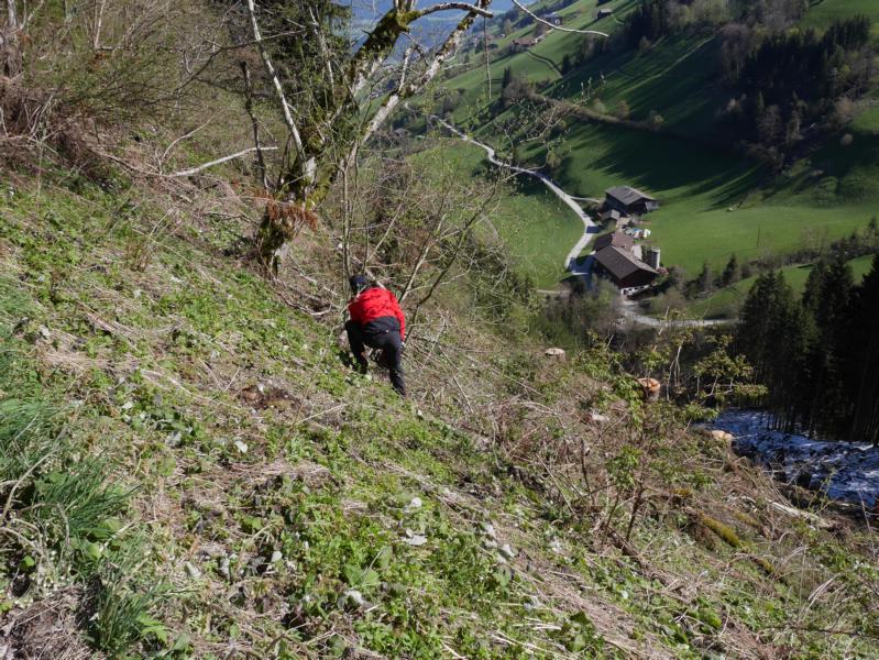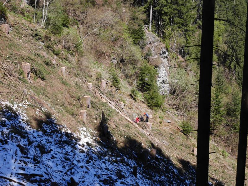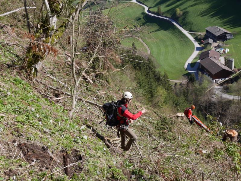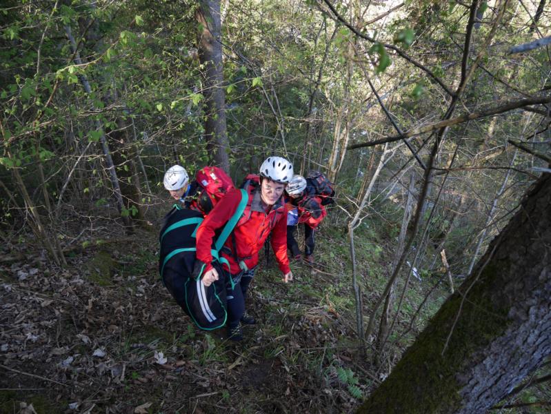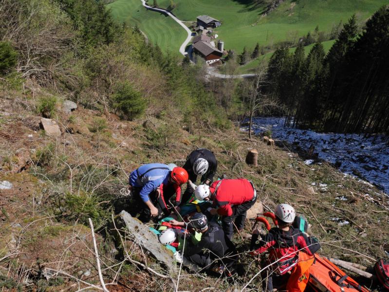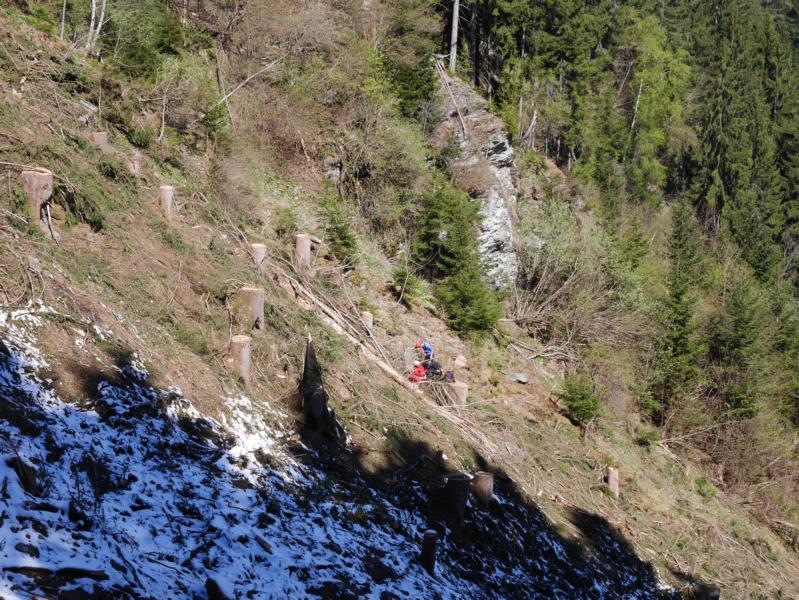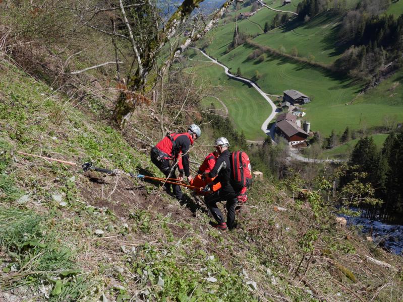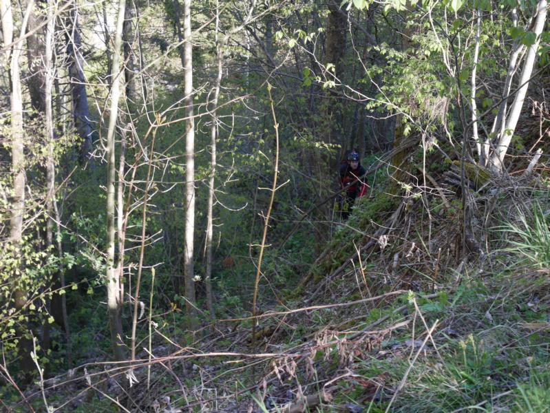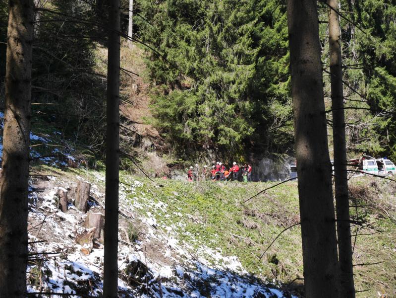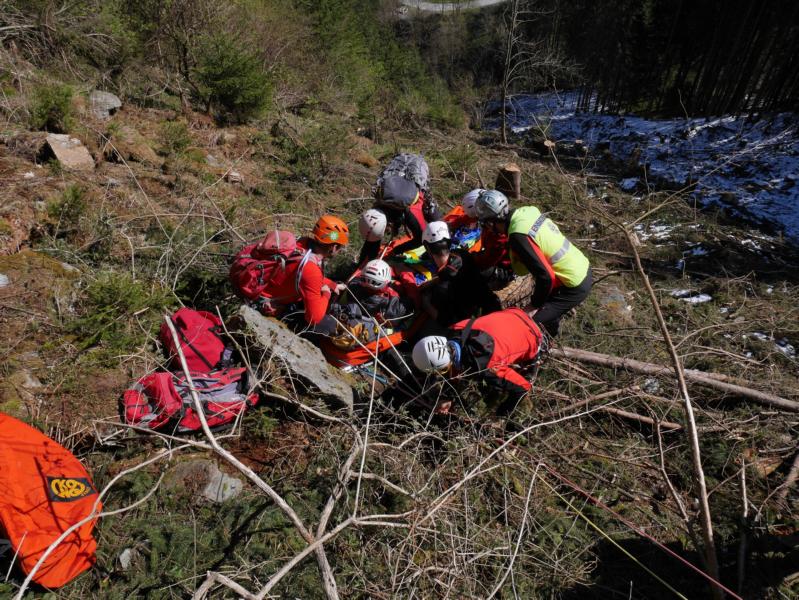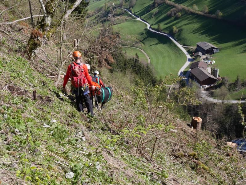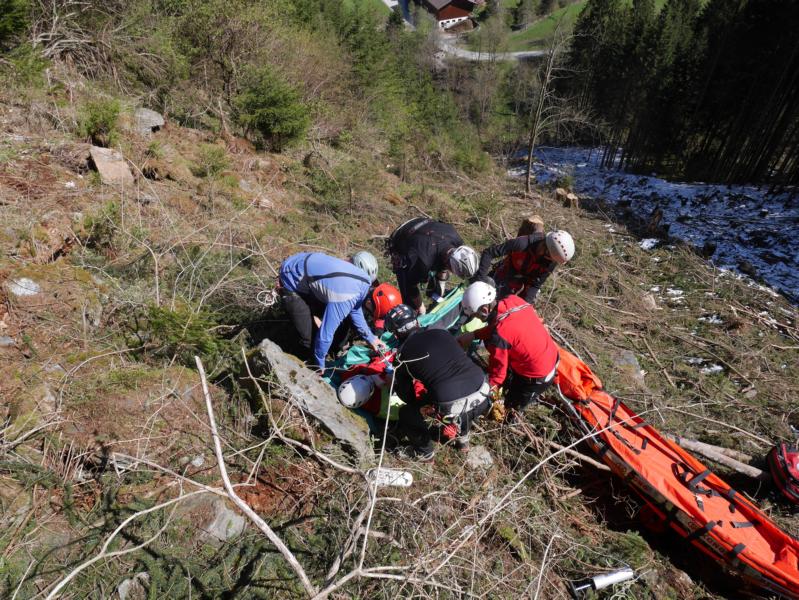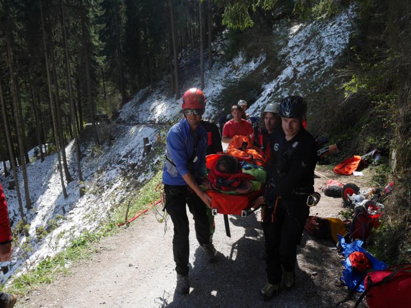 Im Zweiten Teil des Übungstages ging es um die Bergung eines verletzten Holzarbeiters aus einem Holzschlag. Dieser wurde zweimal mit ausgewechselter Berge- und Standmannschaft durchgeführt.