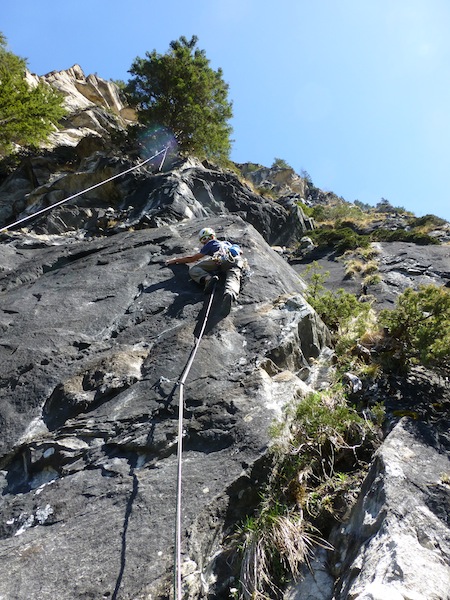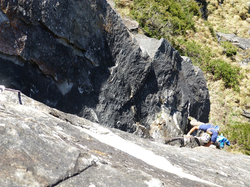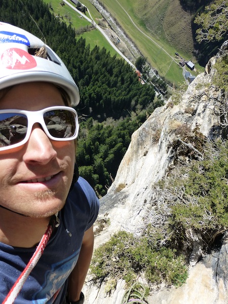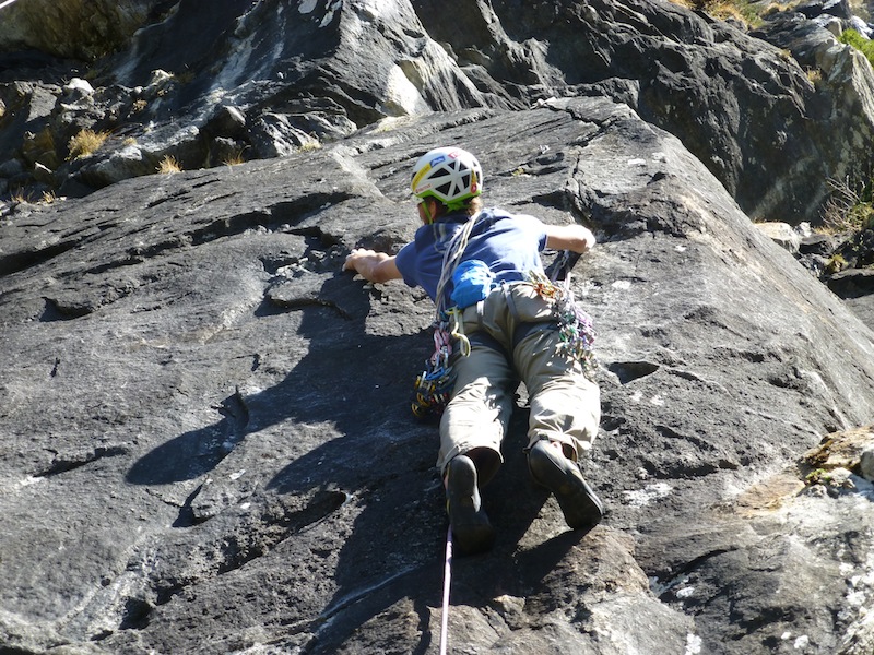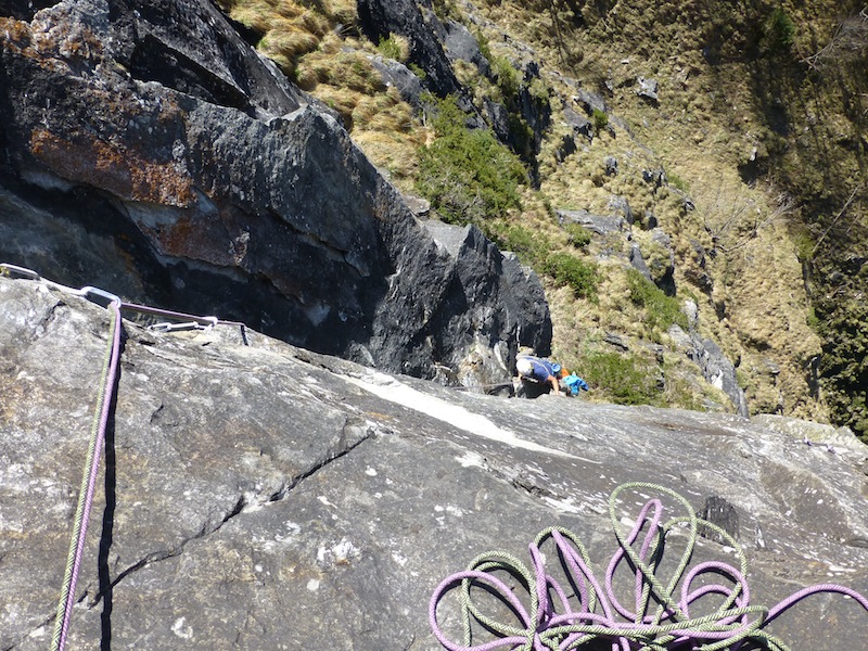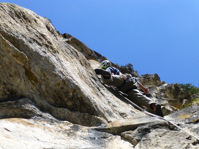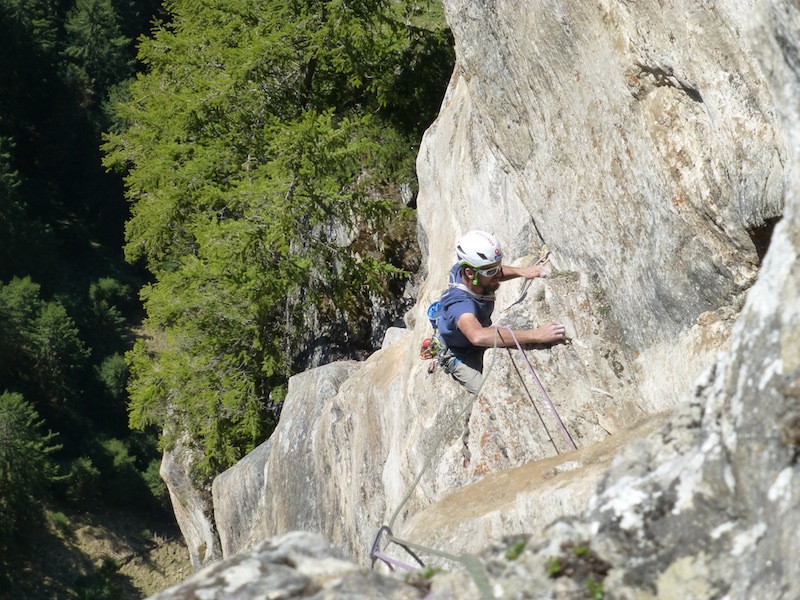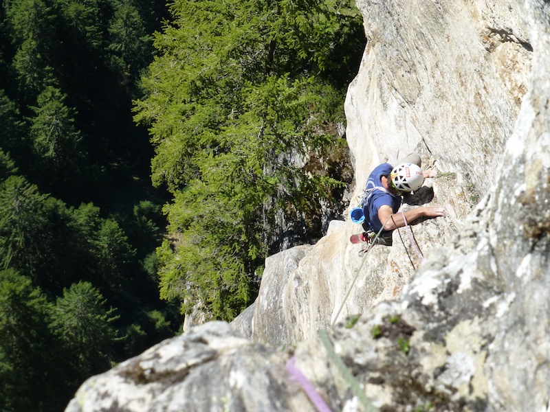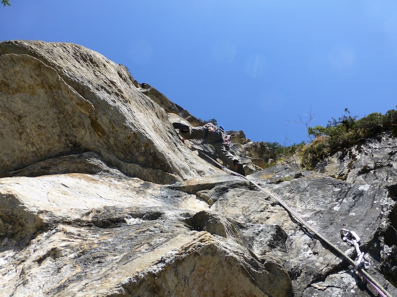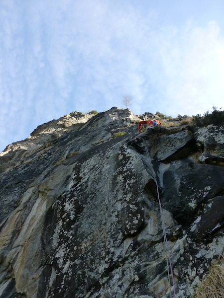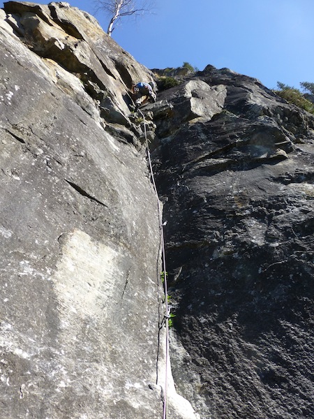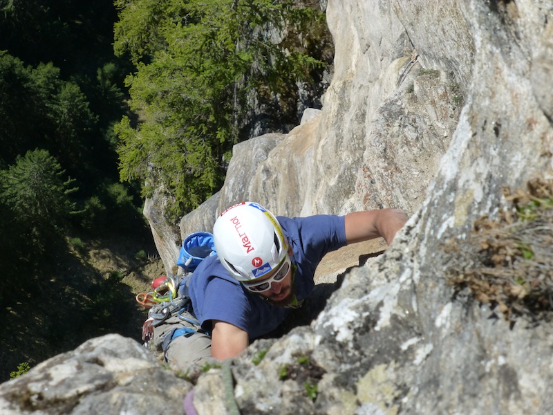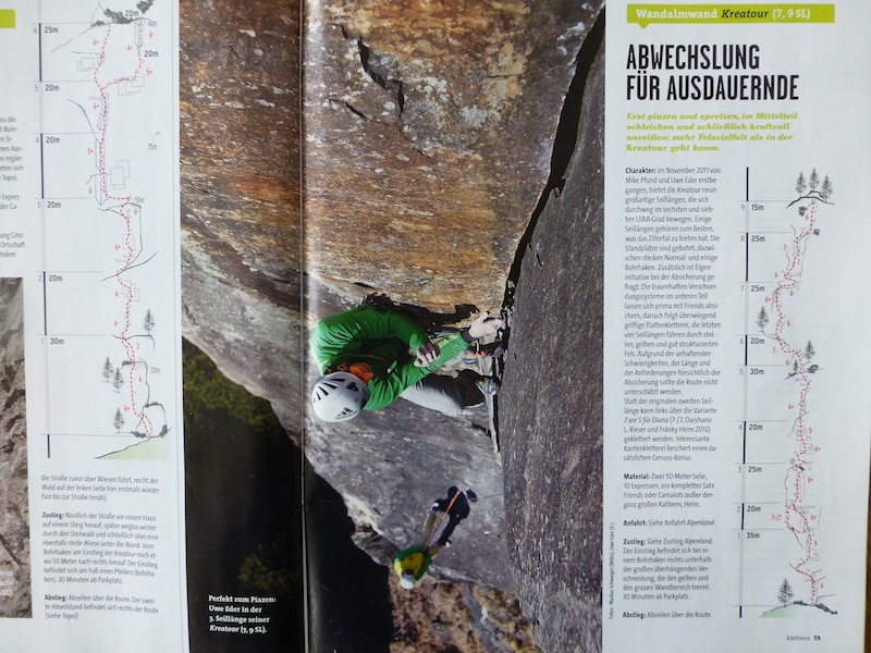 Das Bild von Eder Üwe (BR-Ausbildner) in der Zeitschrift „Klettern“ Ausgabe Februar/März 2014 Seite 73 inspirierte uns seit Erscheinung und so entschlossen Bene und ich am 7.04 bei perfektem Wetter in die Tour einzusteigen. Nach ca. einer halben stunde steilem Zustieg standen wir vor der Wand. Bene startete hinein. Mit noch kalten Fingern wurde uns gleich warm da es schon gleich zur Sache ging und die Sonne raus kam. Wir kletterten alles in Wechselführung! In den ersten 3SL war piazen angesagt und das setzten von Friends nicht immer leicht. Traum Fels und harte Arbeit , doch dann wurde es schon zum Teil brüchig und sehr Alpin (Platten, Überhang, Fingerrisse…)! Die Tour wurde wahrscheinlich noch nicht sehr oft geklettert. Mich erwischte es laut Topo die zwei 7er längen doch wir waren uns einig das jede Seillänge für den angegebenen Schwierigkeits Grad, nicht ganz ohne waren. Wir konnten alles Onsight klettern bis auf die 6SL, die hat uns kurz gefuchst. Schlussendlich ist es für die Schwierigkeit , eine Alpine, sehr anspruchsvolle und oben extrem ausgesetzte Tour!