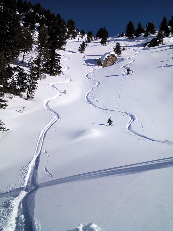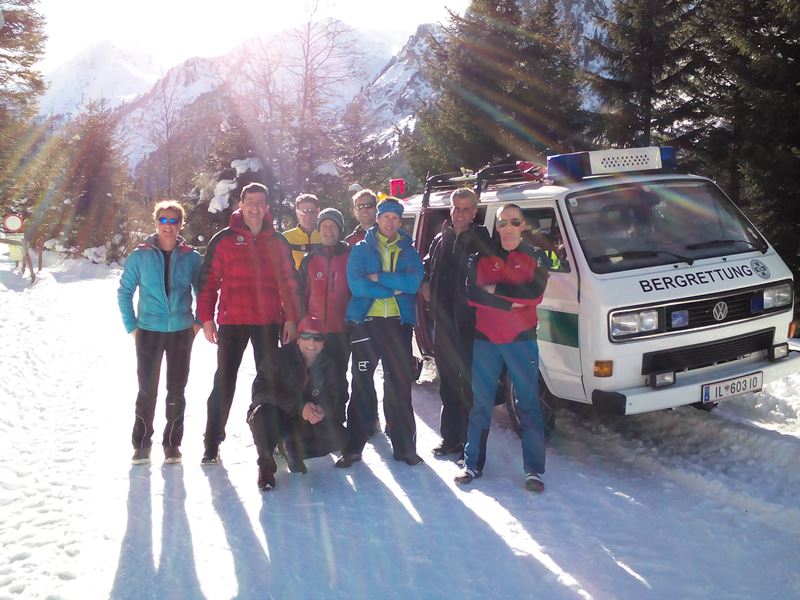 am 31.01.2015 war eigentlich die Lawinenübung angesagt. Diese wurde jedoch, da wir uns der BR Schwaz anschlossen auf das nächste Wochenende verschoben. Auf Grund dessen nutzten wir den Tag zu einer Schulungstour in unser Einsatzgelände. Um einsatzbereit zu sein entschloss ich mich die Tour ins ruhige Voldertal – auf den Haneburger Wintergipfel – zu machen. Wieder erwarten 11 Mitglieder der Ortsstelle pünktlich am morgen am Treffpunkt und so fuhren wir mit dem BR-Nostalgiebus (VW Bus T3 Syncro) nach Volderwildbad, wo wir vorausschauend, um nicht den Rodelausflug von 2013 zu wiederholen, die Ketten auf alle Viere auflegten. Von Nösslach ging es dann über die Anger von Sternbach hinauf zur Markisalm. Bereits im ersten Hang hinauf zur Sternbach-Alm war mir klar, dass der Wind gestern massiv am Werk war. Nach der Markis-Alm spurten wir leicht ansteigend Tal einwärts bis in jene Mulde, welche eigentlich zu unserem Ziel führen sollte. Dort angekommen traute ich meinen Augen nicht. Der Wind hatte ganze Arbeit geleistet. Eine Steinwüste (neudeutsch Shark-Desert) lag vor uns. In Absprache mit Christian entschlossen wir nach rechts in eine Mulde zu queren und dort durch das shark-Aquarium weiter aufzusteigen. Es löste sich eigentlich alles gut auf und am Haneburger-Wintergipfel angekommen hatte Christian die Idee hinein, unter dem Malgrübler-Kar in die nächste große Mulde zu queren, da diese mehr Schnee zeigte. Dieser Geistesblitz entpuppte sich als Lotto-6er und so hatten wir eine super Abfahrt über das Kar und weiter durch den Zirbenwald bis zur Vorberg-Alm von wir den Weg zurück zum Auto folgten.