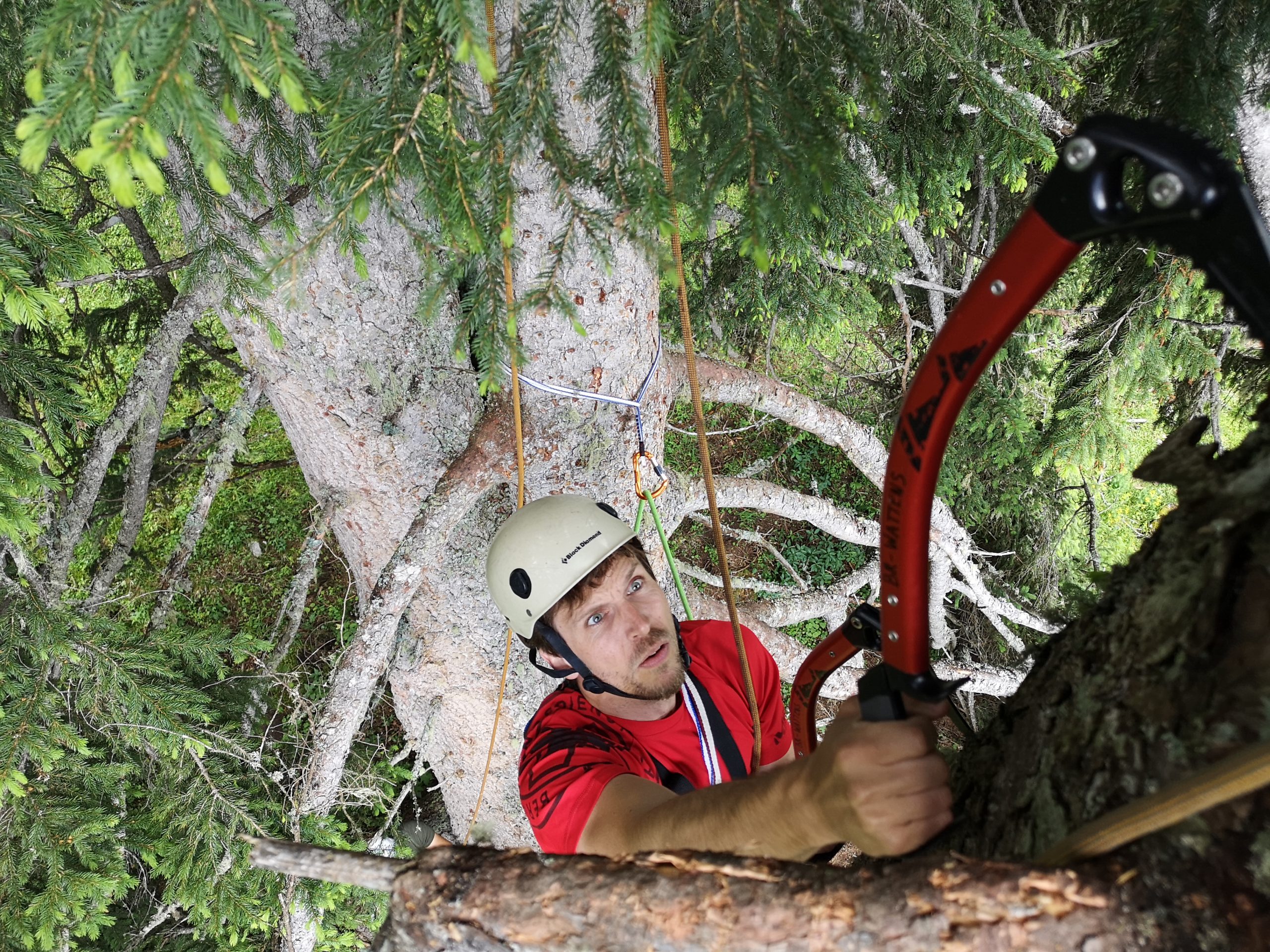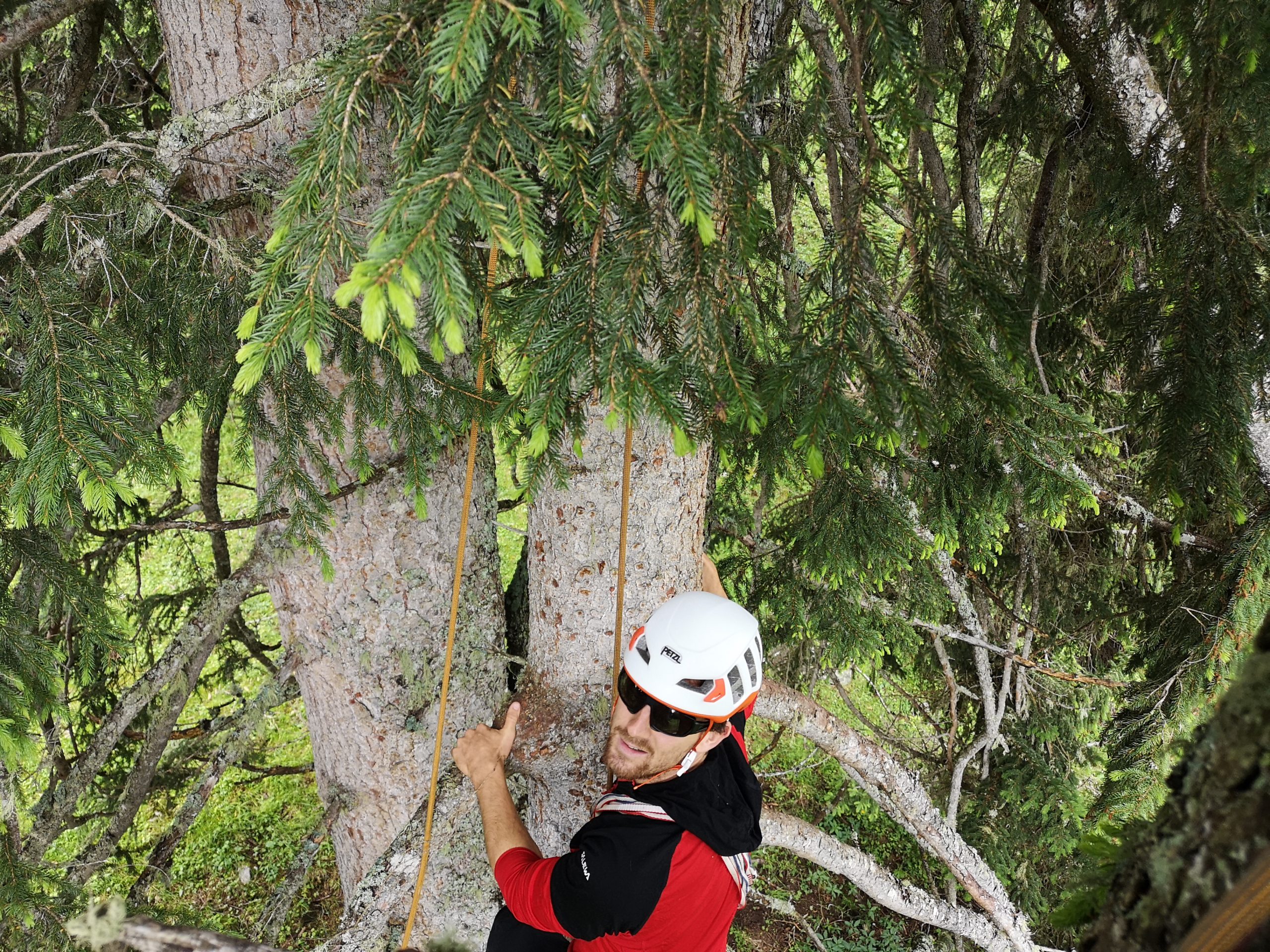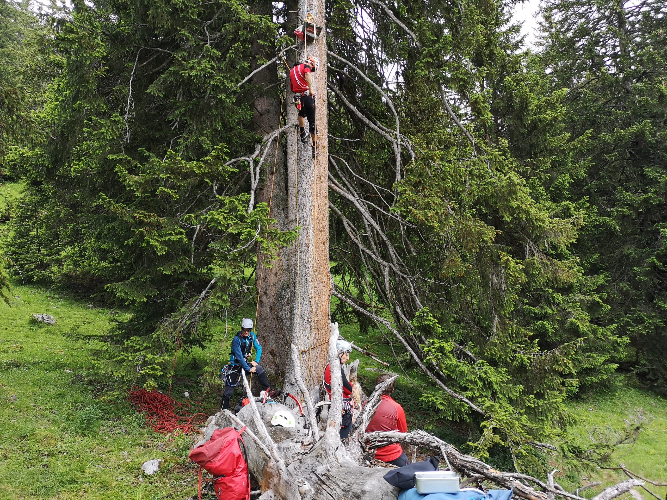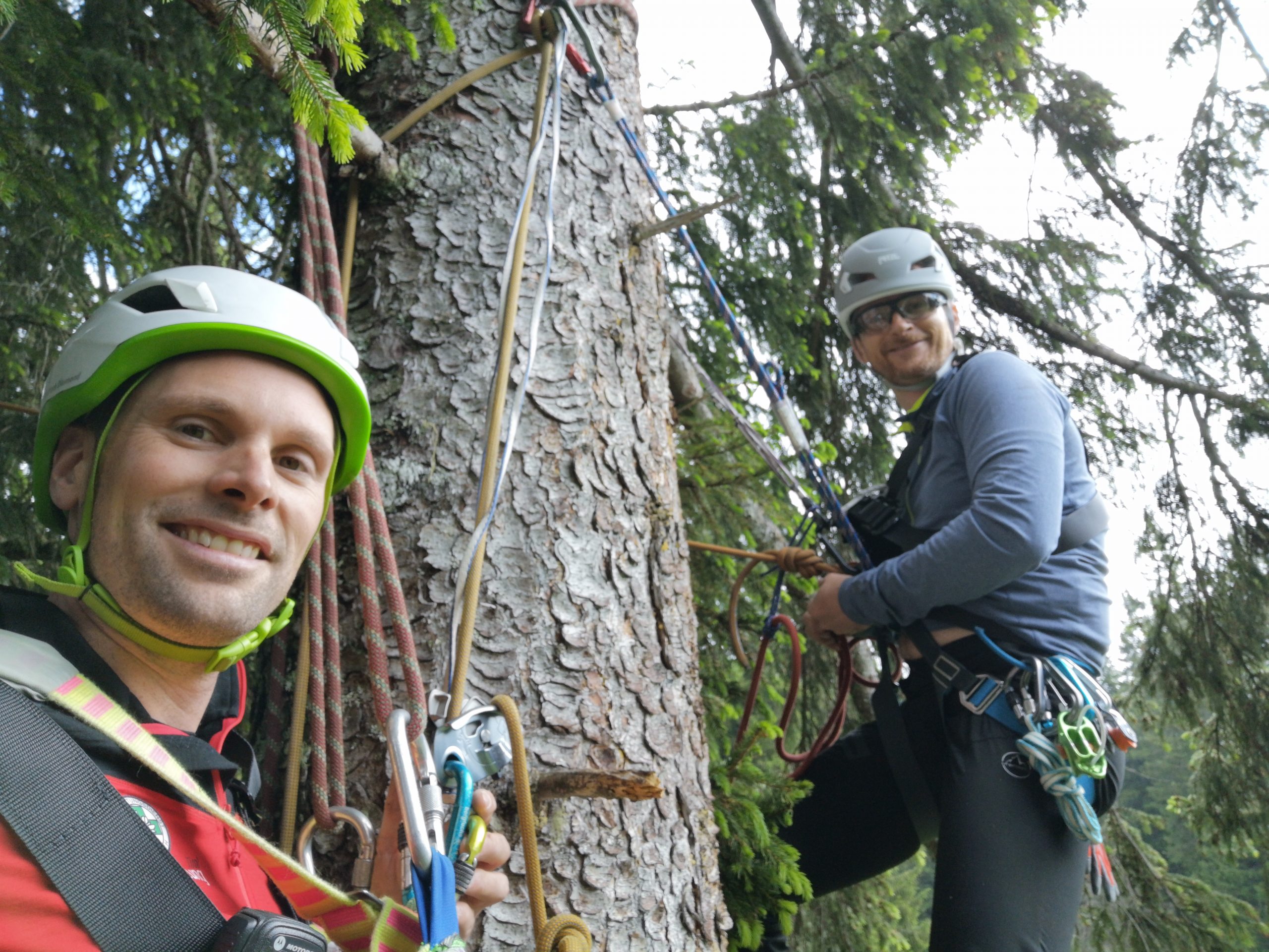 Bergeübung. Bergung eines abgestürzten Gleitschirmpiloten aus einem Baum. Erklettern des Baumes, sichern des verunfallten, Versorgung des Piloten mit anschließender Bergung vom Baum und herrichten zum Abtransport.