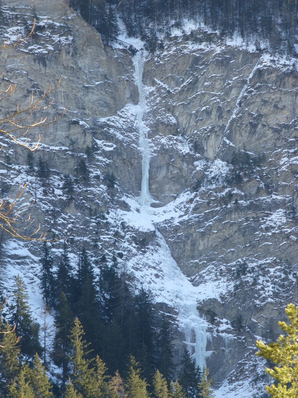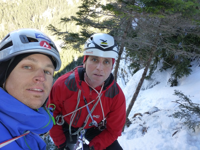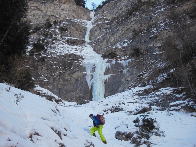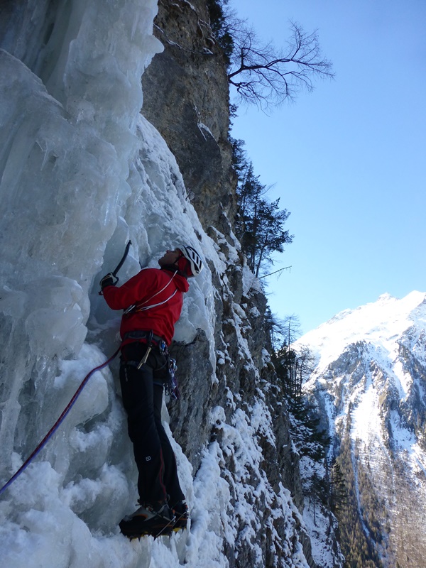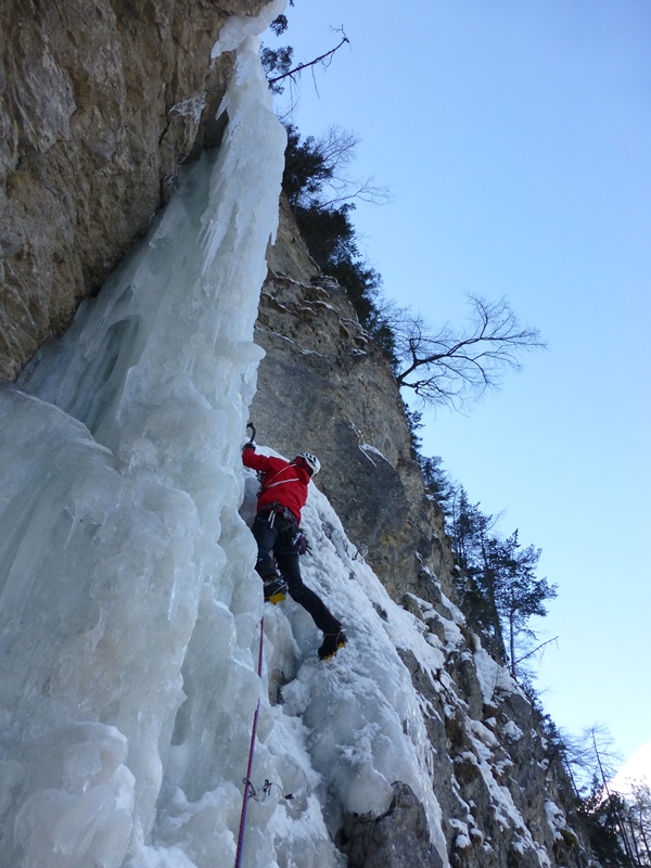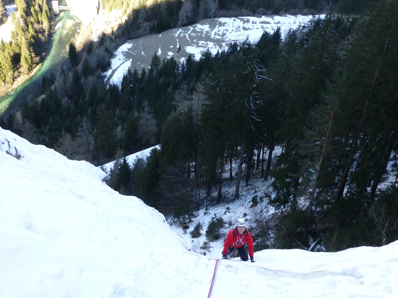 … nachdem Dominik „das Problem“ hoch über Hochfinstermünz bereits im Nachstieg geklettert hatte, wollte er dieses natürlich auch am „scharfen Ende“ des Seils punkten. Und so fuhren wir kurz entschlossen an den Eingang des Engadins und stiegen hinauf zu dieser für mich „verdammt“ steil wirkenden Eisspur. Der erste Eindruck täuschte mich nicht. Diskussionen hin oder her, immer noch schwer trotz der heuer guten Verhältnisse vor Ort. Wir folgten einer Seilschaft, eigens angereist aus dem Pinzgau 😉 welche die guten Verhältnisse ebenso nutzte. Dominik konnte wie bereits erwartet die schweren Längen tadellos klettern. Die Leichteren blieben mir übrig. Alles in allem ein genialer Fall.