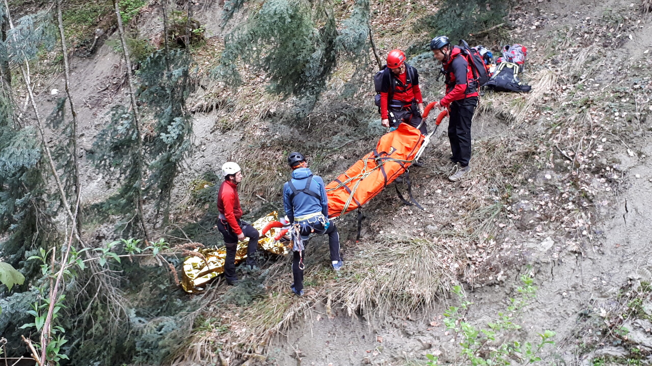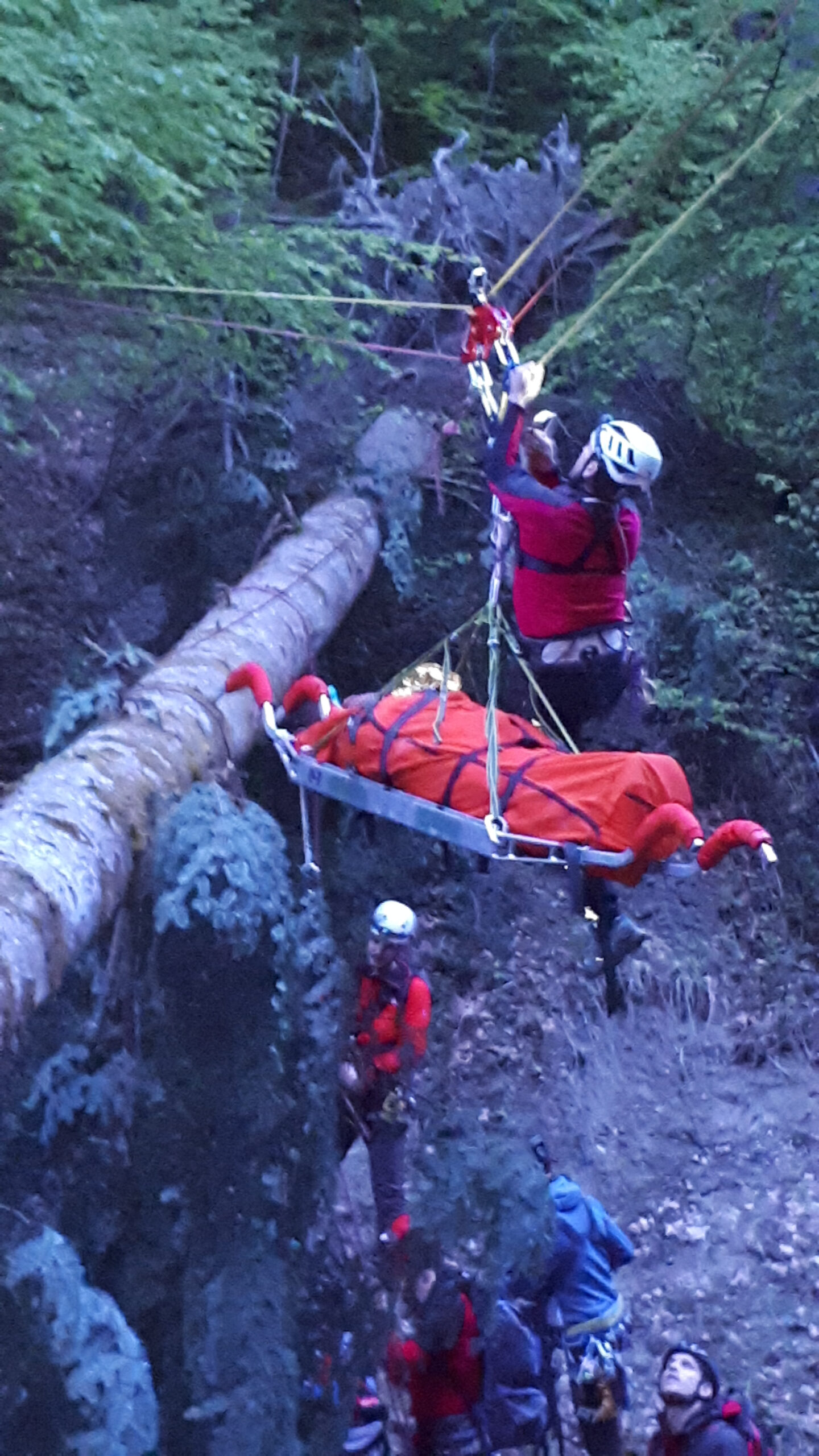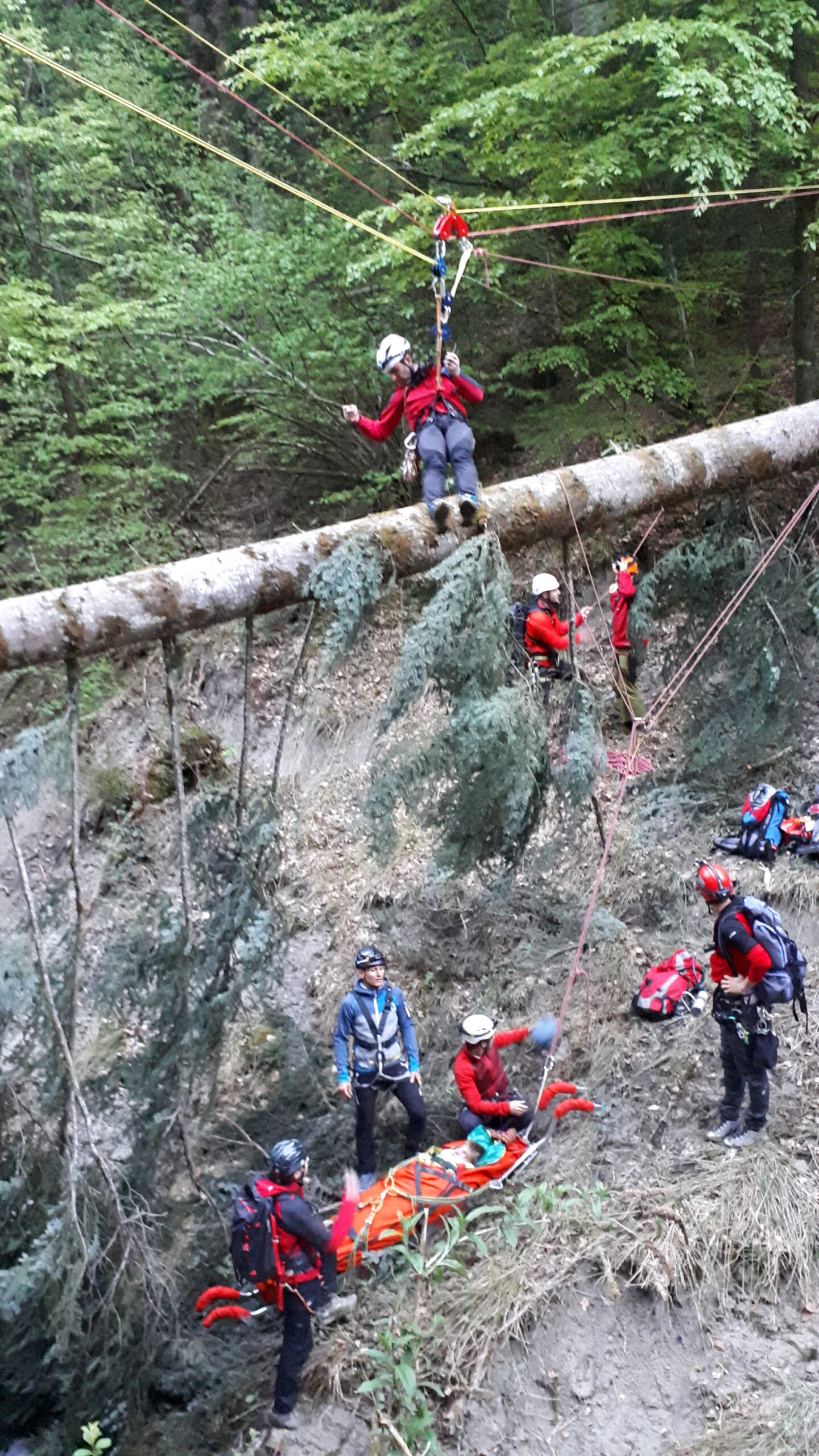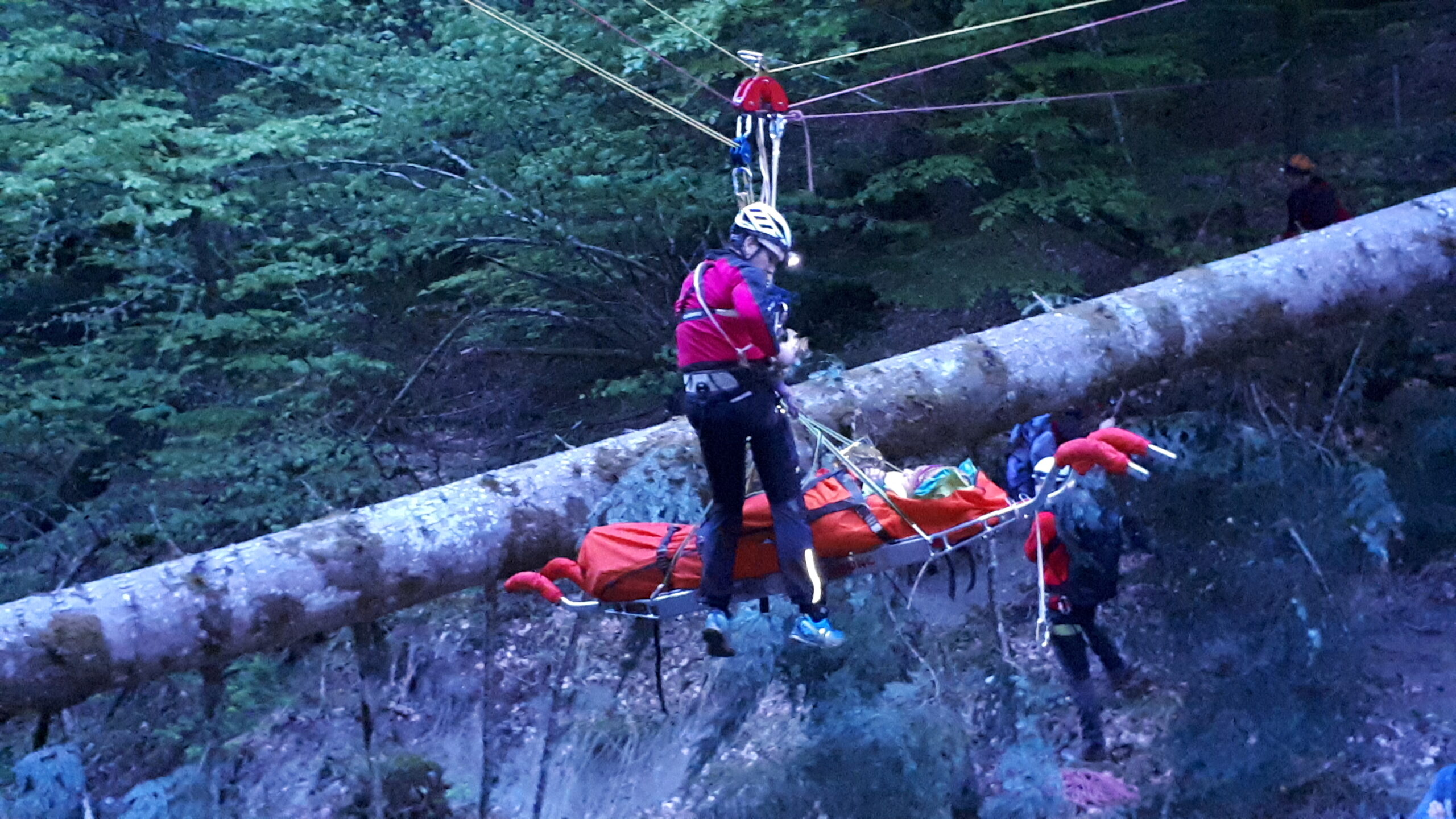 „Schwer verletzter Forstarbeiter in unwegsamen Gelände im Bereich des Farbentales in Fritzens.“ Nach dem schneereichen Winter, der in unseren Wäldern viele Bäume zum Umknicken gebracht hatte, eine durchaus realistische Unfallannahme, die sich unser Ausbildungsteam für uns Mitglieder ausgedacht hat. Es muss ja nicht immer ein Unfall im Hochgebirge sein. Nachdem unser „Opfer“ an einem schwer zugänglichen Platz in einem Graben in Bachnähe lag, entschlossen wir uns zur Bergung mit der Seilbahn. Auf beiden Seiten des Grabens eine stabile Verankerung an einem ausgewachsenen Baum, das Dyneema-Seil gespannt und schon konnte es losgehen. Der Retter wird an den gespannten Seilen mittels Rolle bis über den Verletzten gebracht und punktgenau abgelassen. Nachdem der Verletze fachgerecht versorgt und in der Gebirgstrage verpackt war, geht es an die Bergung, die das eingespielte Team in kurzer Zeit abschließen konnte. Nachdem das Opfer wieder auf sicherem Boden war, erfolgte der weitere Abtransport mit der Gebirgstrage mit Rad. Das war dann schon Routine für uns.“