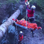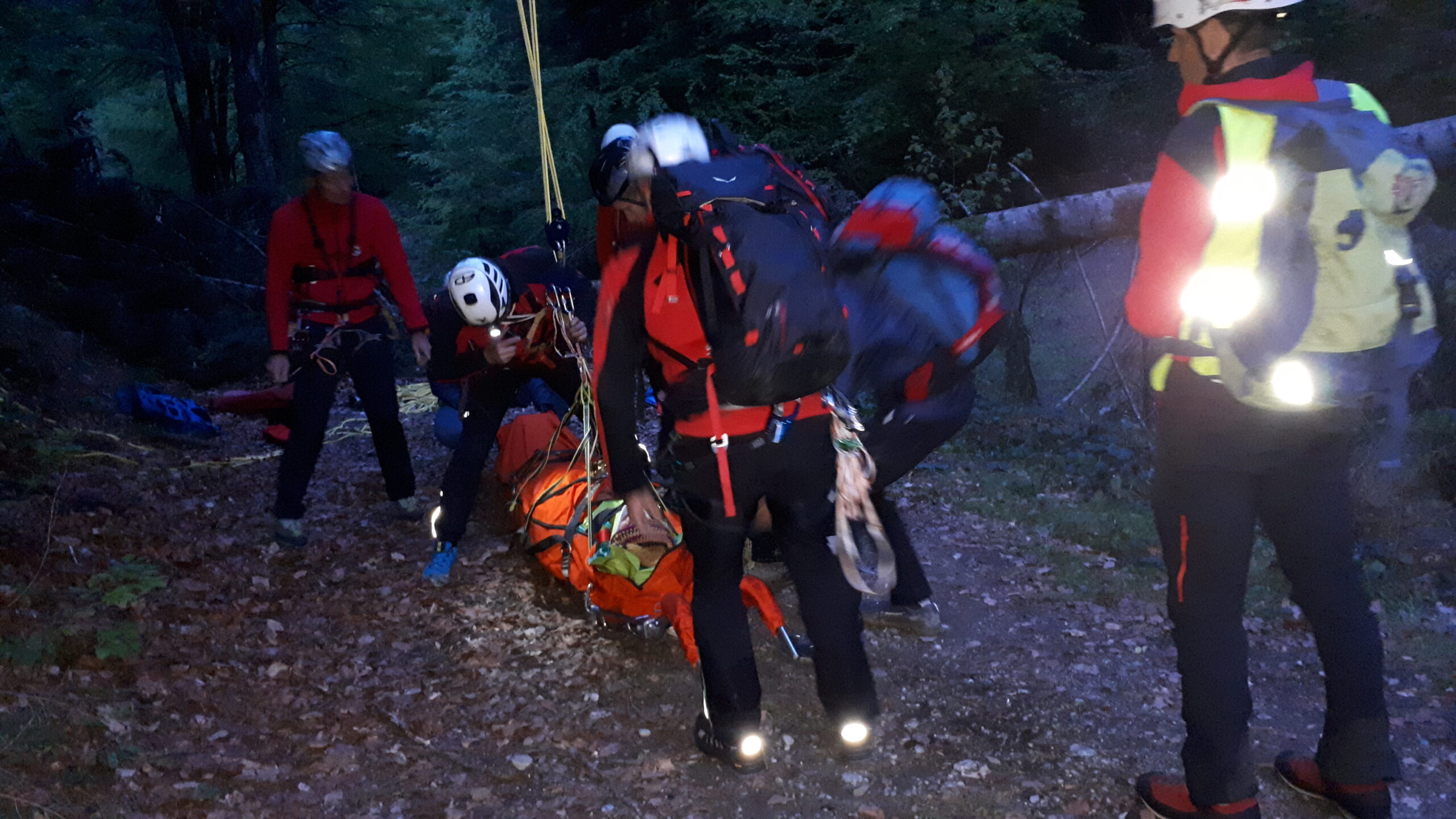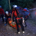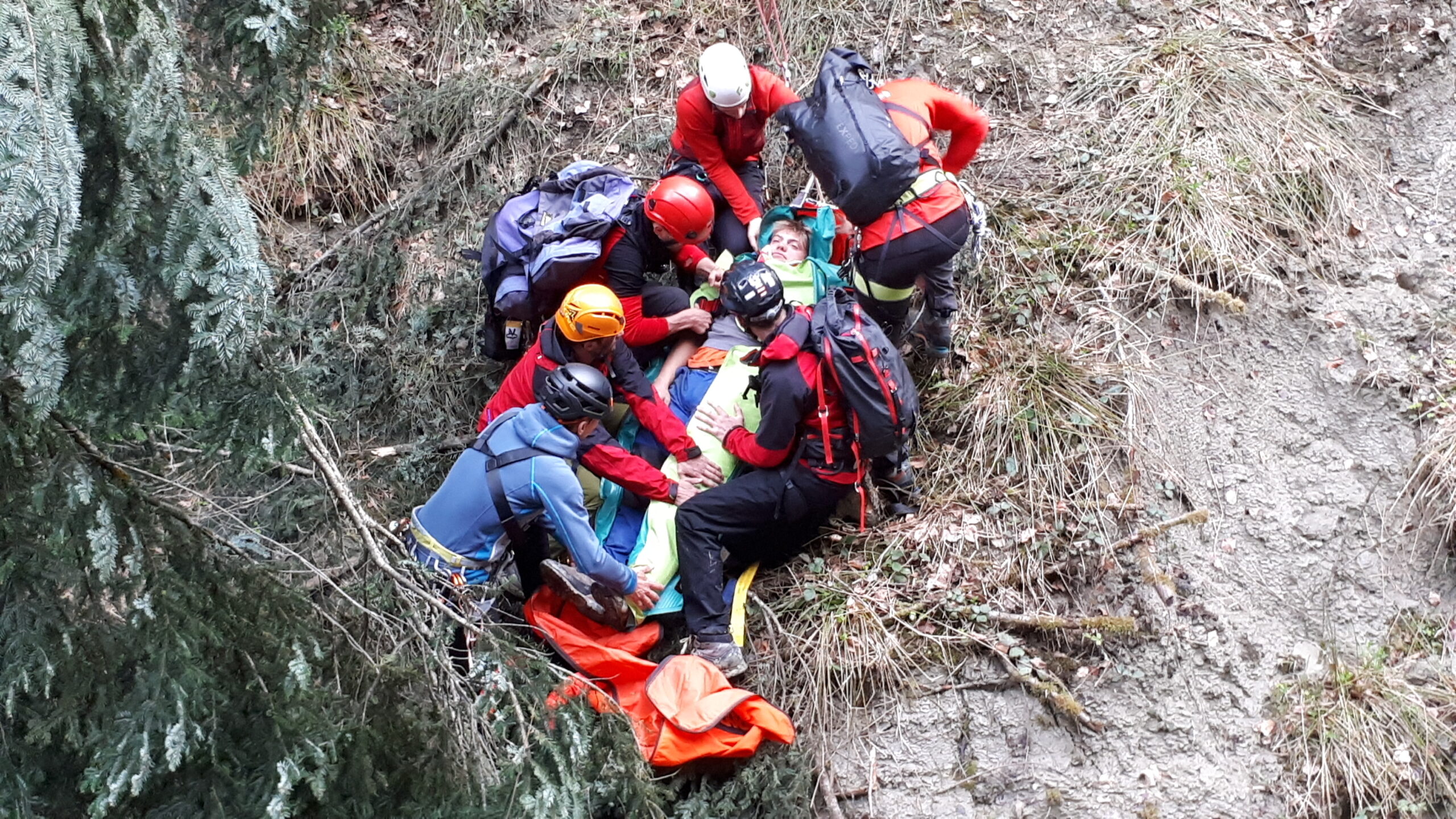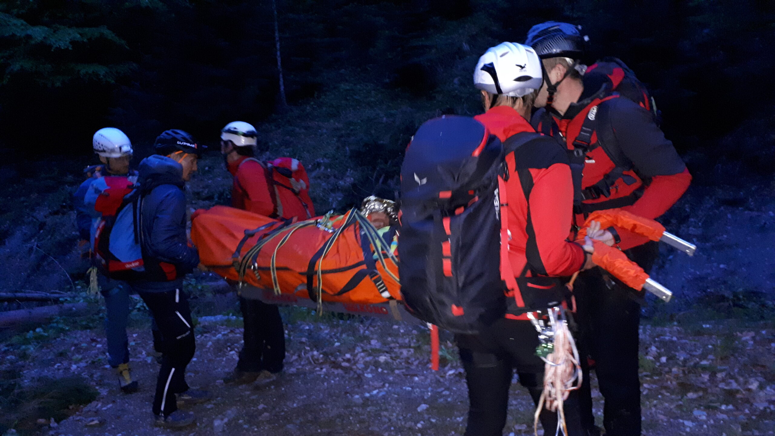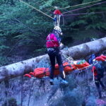 „Schwer verletzter Forstarbeiter in unwegsamen Gelände im Bereich des Farbentales in Fritzens.“ Nach dem schneereichen Winter, der in unseren Wäldern viele Bäume zum Umknicken gebracht hatte, eine durchaus realistische Unfallannahme, die sich unser Ausbildungsteam für uns Mitglieder ausgedacht hat. Es muss ja nicht immer ein Unfall im Hochgebirge sein. Nachdem unser „Opfer“ an einem schwer zugänglichen Platz in einem Graben in Bachnähe lag, entschlossen wir uns zur Bergung mit der Seilbahn. Auf beiden Seiten des Grabens eine stabile Verankerung an einem ausgewachsenen Baum, das Dyneema-Seil gespannt und schon konnte es losgehen. Der Retter wird an den gespannten Seilen mittels Rolle bis über den Verletzten gebracht und punktgenau abgelassen. Nachdem der Verletze fachgerecht versorgt und in der Gebirgstrage verpackt war, geht es an die Bergung, die das eingespielte Team in kurzer Zeit abschließen konnte. Nachdem das Opfer wieder auf sicherem Boden war, erfolgte der weitere Abtransport mit der Gebirgstrage mit Rad. Das war dann schon Routine für uns.“